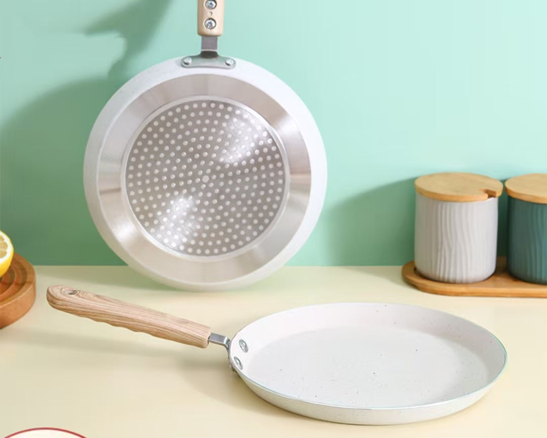 ✨ 高顏值外觀:純白鍋身搭配原木手柄,簡約時尚,可直接端上餐桌當餐盤使用。