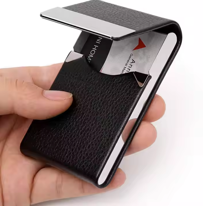 ✨ 優質材質:高品質 PU 皮革與不鏽鋼相結合,打造出獨特風格的卡片盒。