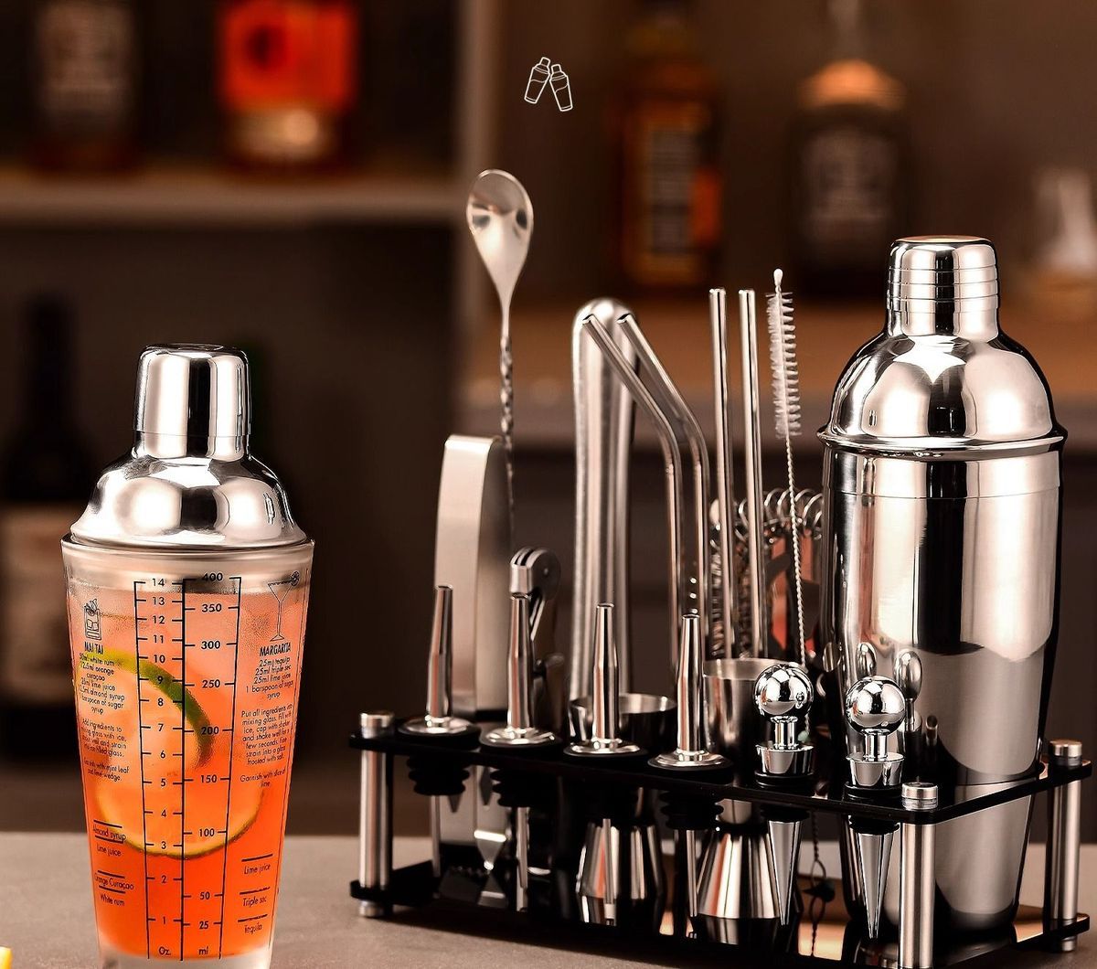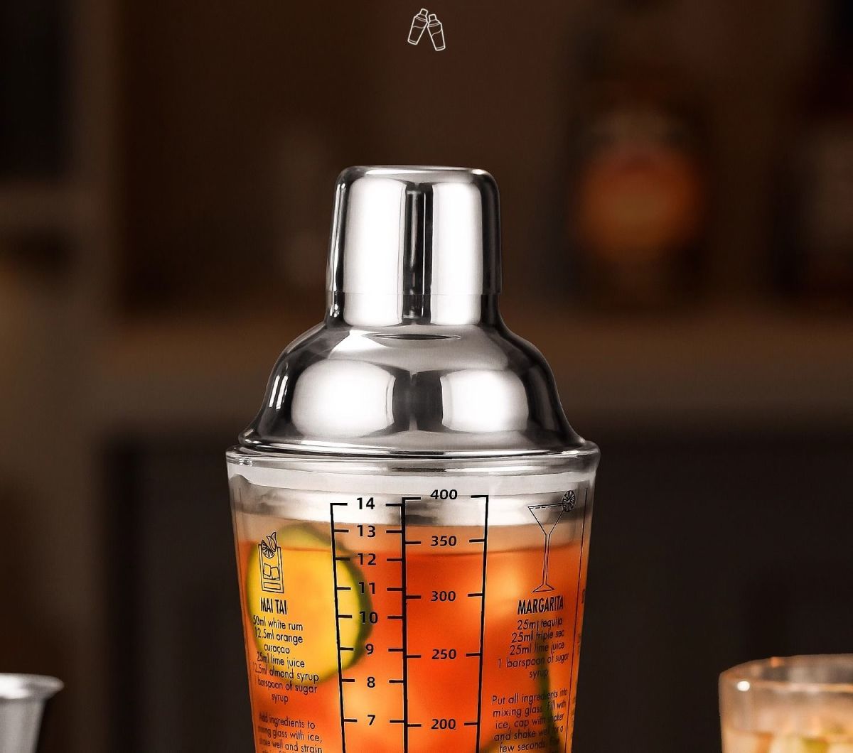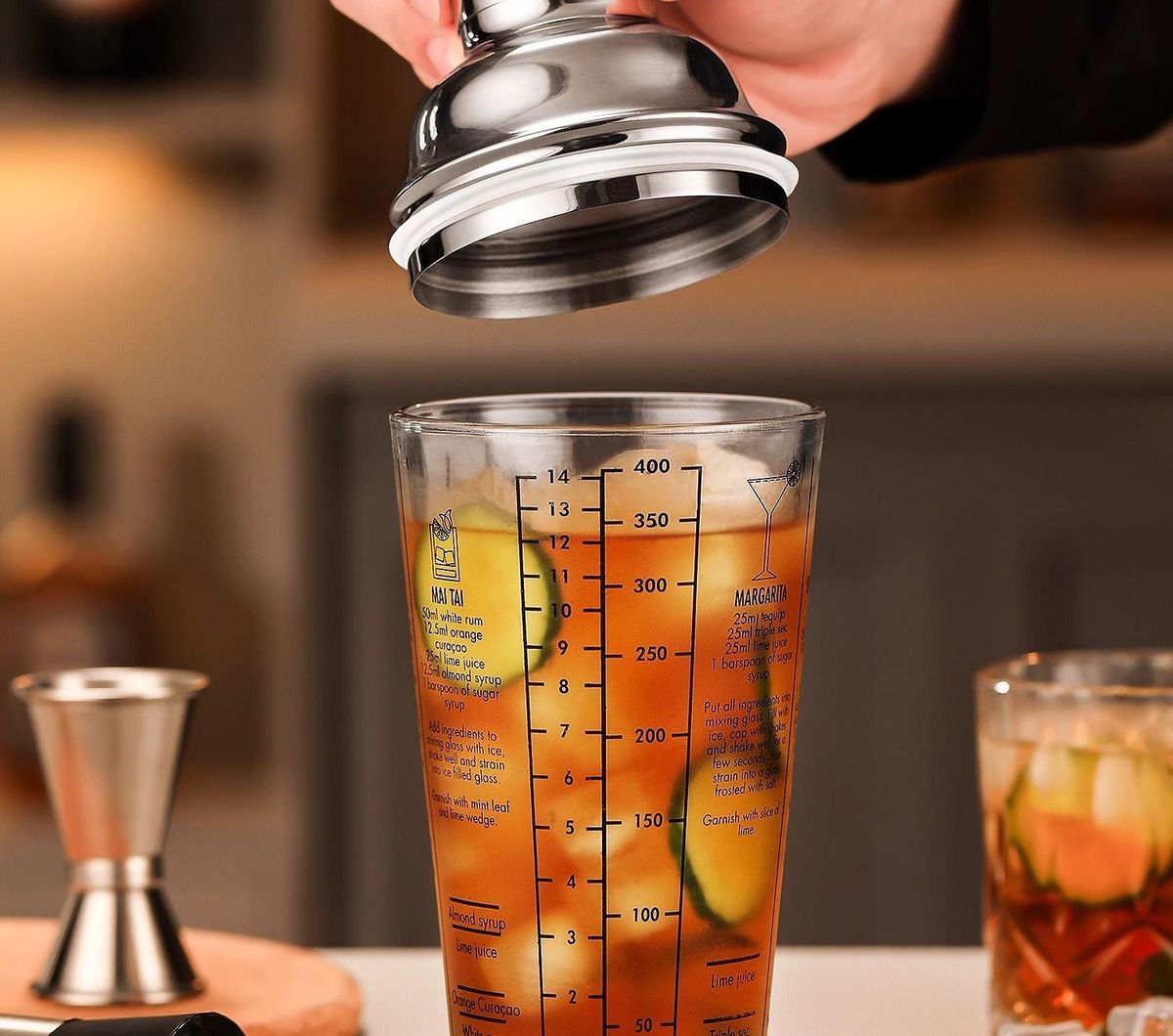 ✨ 可視玻璃杯:杯身通透、刻度清晰,杯身有六種調酒配方。